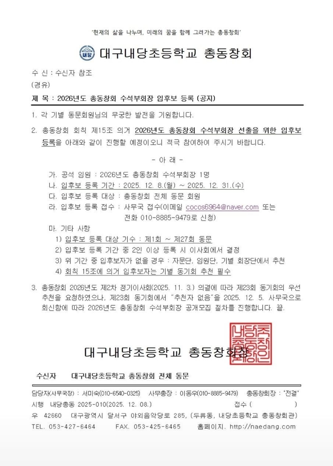 2026³âµµ Ãѵ¿Ã¢È¸ ¼ö¼®ºÎȸÀå ÀÔÈĺ¸ µî·Ï ¾È³»