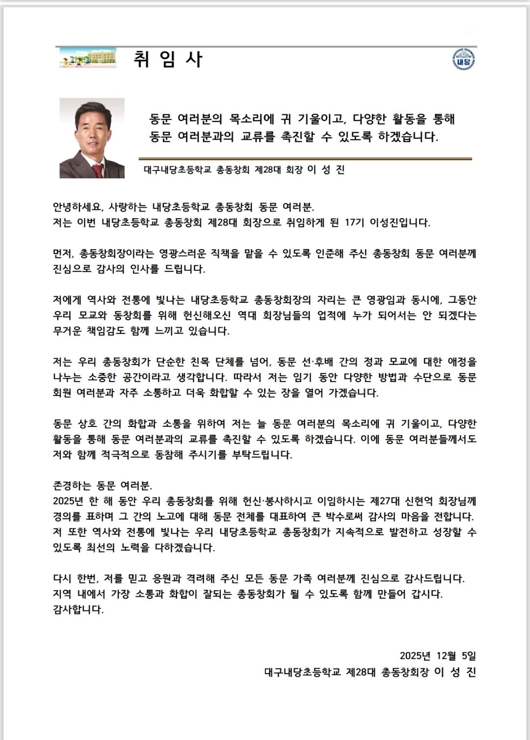 2026³â Á¦ 28´ë Ãѵ¿Ã¢È¸Àå À̼ºÁø µ¿¹® ÃëÀÓÀλç