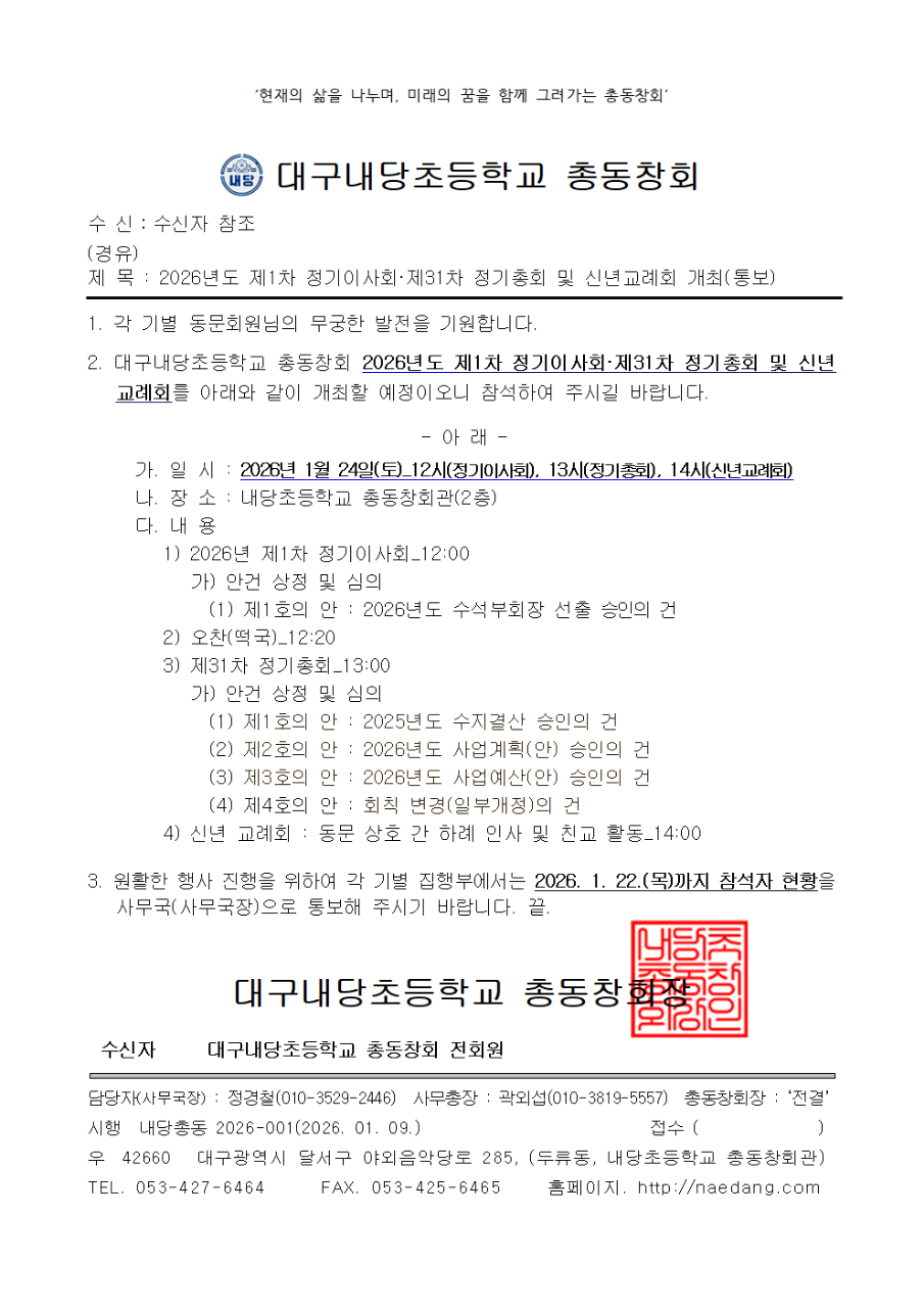 2026³â Á¦ 1Â÷ Á¤±âÀÌ»çȸ, Á¦ 31Â÷ Á¤±âÃÑȸ ¹× ½Å³â±³·Êȸ °øÁö